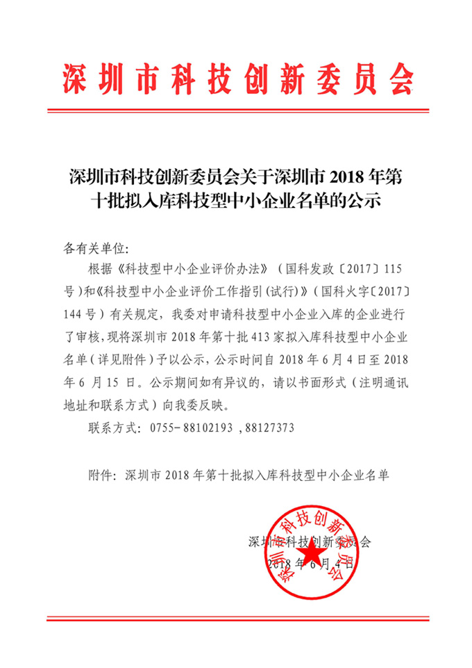 After the Guangdong Provincial Government, Shenzhen Science and Technology Innovation Committee, Shenzhen Futian District Science and Technology Creation Bureau unanimously affirmed that the successful storage of "science and technology innovation enterprises" list.